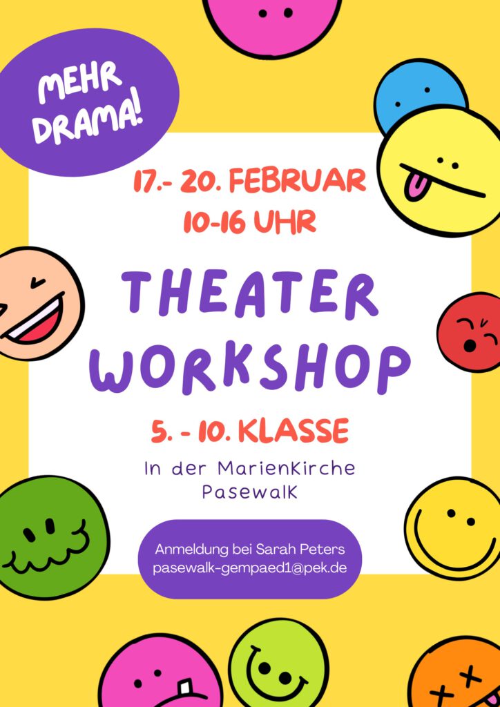 Du hast Lust in andere Rollen zu schlüpfen, dir Geschichten auszudenken und zu spielen? Dann mach mit bei unserem Theaterworkshop! Vom 17.-20. Februar 10-16 Uhr verwandelt sich der Jugendraum in der Marienkirche Pasewalk in ein Schauspiellabor, in dem wir improvisieren, Texte schreiben und Szenen für verschiedene Medien entwickeln. Am Sonntag, den 22. Februar präsentieren wir einige unserer Ergebnisse im Rahmen des Gottesdienstes. Eingeladen sind alle Kinder und Jugendlichen der 5.-10. Klasse. Vorerfahrung und Kirchenmitgliedschaft sind keine Voraussetzung.
